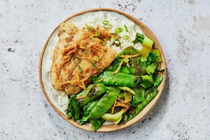 - Simple and satisfying: Miso-glazed fish with steamed broccoli, carrots, and a small portion of sticky rice